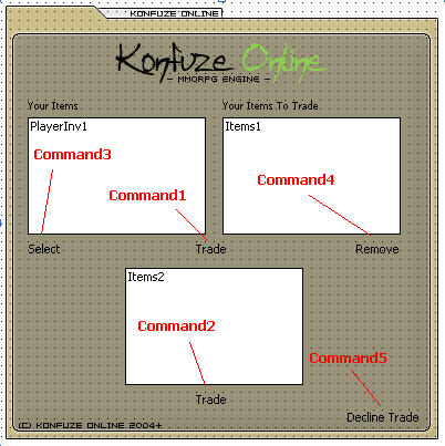 ' ::::::::::::::::::::::::::::::::::::: ' :: Retrieve the player's inventory :: ' ::::::::::::::::::::::::::::::::::::: If LCase(Parse(0)) = "pptrading" Then frmPlayerTrade.Items1.Clear frmPlayerTrade.Items2.Clear For i = 1 To MAX_PLAYER_TRADES Trading(i).InvNum = 0 Trading(i).InvName = "" Trading2(i).InvNum = 0 Trading2(i).InvName = "" frmPlayerTrade.Items1.AddItem i & ": <Nothing>" frmPlayerTrade.Items2.AddItem i & ": <Nothing>" Next i frmPlayerTrade.Items1.ListIndex = 0 Call UpdateTradeInventory frmPlayerTrade.Show vbModeless, frmMirage Exit Sub End If ' :::::::::::::::::::::::::::::: ' :: Stop trading with player :: ' :::::::::::::::::::::::::::::: If LCase(Parse(0)) = "qtrade" Then For i = 1 To MAX_PLAYER_TRADES Trading(i).InvNum = 0 Trading(i).InvName = "" Trading2(i).InvNum = 0 Trading2(i).InvName = "" Next i frmPlayerTrade.Command1.ForeColor = &H0& frmPlayerTrade.Command2.ForeColor = &H0& frmPlayerTrade.Visible = False Exit Sub End If ' :::::::::::::::::::::::::::::: ' :: Stop trading with player :: ' :::::::::::::::::::::::::::::: If LCase(Parse(0)) = "updatetradeitem" Then n = Val(Parse(1)) Trading2(n).InvNum = Val(Parse(2)) Trading2(n).InvName = Parse(3) If STR(Trading2(n).InvNum) <= 0 Then frmPlayerTrade.Items2.List(n - 1) = n & ": <Nothing>" Else frmPlayerTrade.Items2.List(n - 1) = n & ": " & Trim(Trading2(n).InvName) End If Exit Sub End If ' :::::::::::::::::::::::::::::: ' :: Stop trading with player :: ' :::::::::::::::::::::::::::::: If LCase(Parse(0)) = "trading" Then n = Val(Parse(1)) If n = 0 Then frmPlayerTrade.Command2.ForeColor = &H0& If n = 1 Then frmPlayerTrade.Command2.ForeColor = &HFF00& Exit Sub End If Now make a new form and call it frmPlayerTrade In the new form make 3 listboxes. Put 2 at the top beside each other (these are the ones showing the items your trading) Name the left one PlayerInv1 and the right one Items1 Now put the third listbox below those two (the items the other player is trading) Name it Items2 Now make 5 labels. Here is what to name all of them: